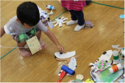 ハイキングで拾ってきた葉っぱや木の実、枝を使ってかわいい虫や動物、アクセサ リーなどを作りました。みんな自由に考えて素敵なオブジェができました!